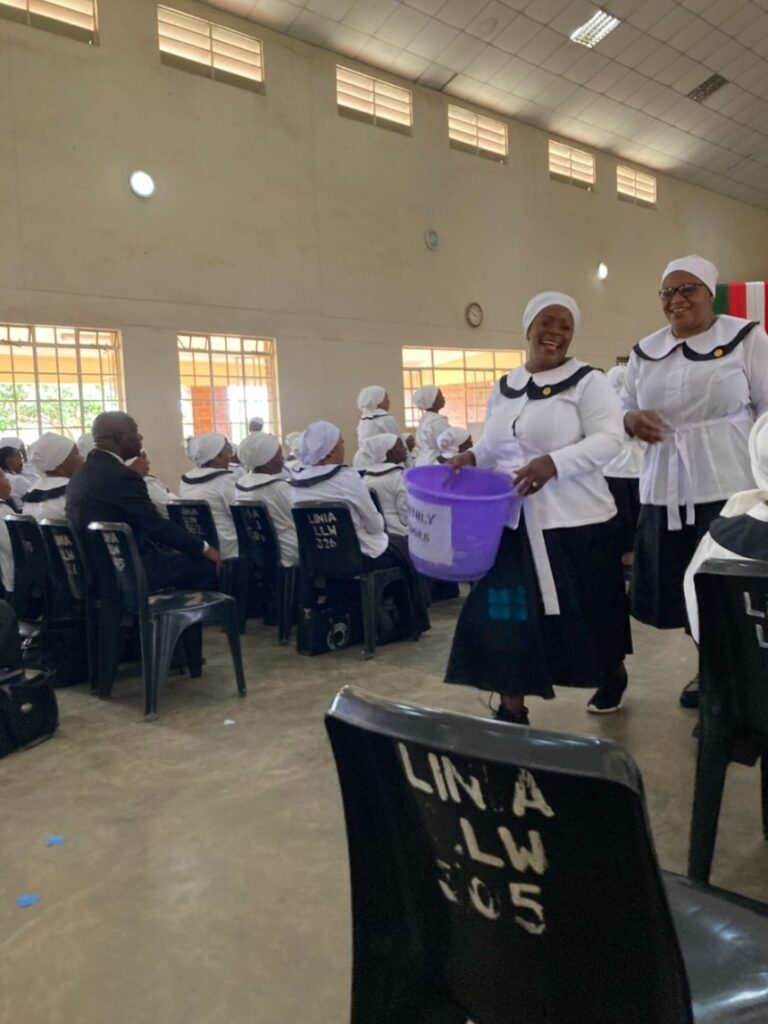 In deze dienst werden ook ambtsdragers en diaconessen bevestigd. Voorin de kerk kregen de ambtsdragers hun stropdas en colbert aangedaan, die ze zelf hadden gekocht (foto 3 en 4). De diaconessen kregen een hoofddoek omgebonden. Hiervan heb ik alleen video’s, die ik niet kan uploaden. De namen werden voorgelezen, er volgden toespraken en uiteraard werden zij op verschillende manieren toegezongen. Iedereen die dat wilde, kon de ambtsdragers en diaconessen tijdens de dienst voorin de kerk feliciteren.
